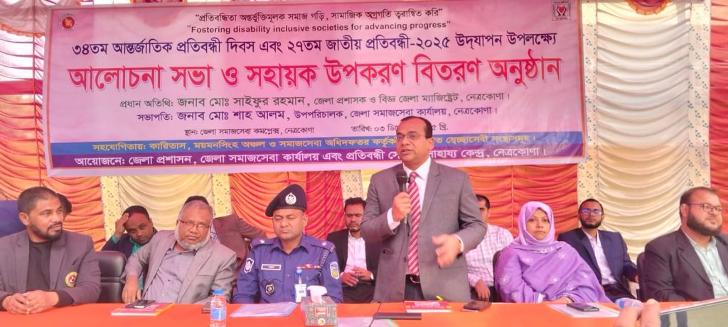 ৩৪তম আন্তর্জাতিক প্রতিবন্ধী দিবস এবং ২৭তম জাতীয় প্রতিবন্ধী ২০২৫ উদযাপন উপলক্ষে নেত্রকোনায় বর্ণাঢ্য র্যালী, আলোচনা সভা ও সহায়ক উপকরণ বিতরণ অনুষ্ঠান অনুষ্ঠিত হয়েছে।“প্রতিবন্ধিতা অন্তর্ভুক্তিমূলক সমাজ গড়ি, সামাজিক অগ্রগতি তরান্বিত করি” এই প্রতিপাদ্যকে সামনে রেখে